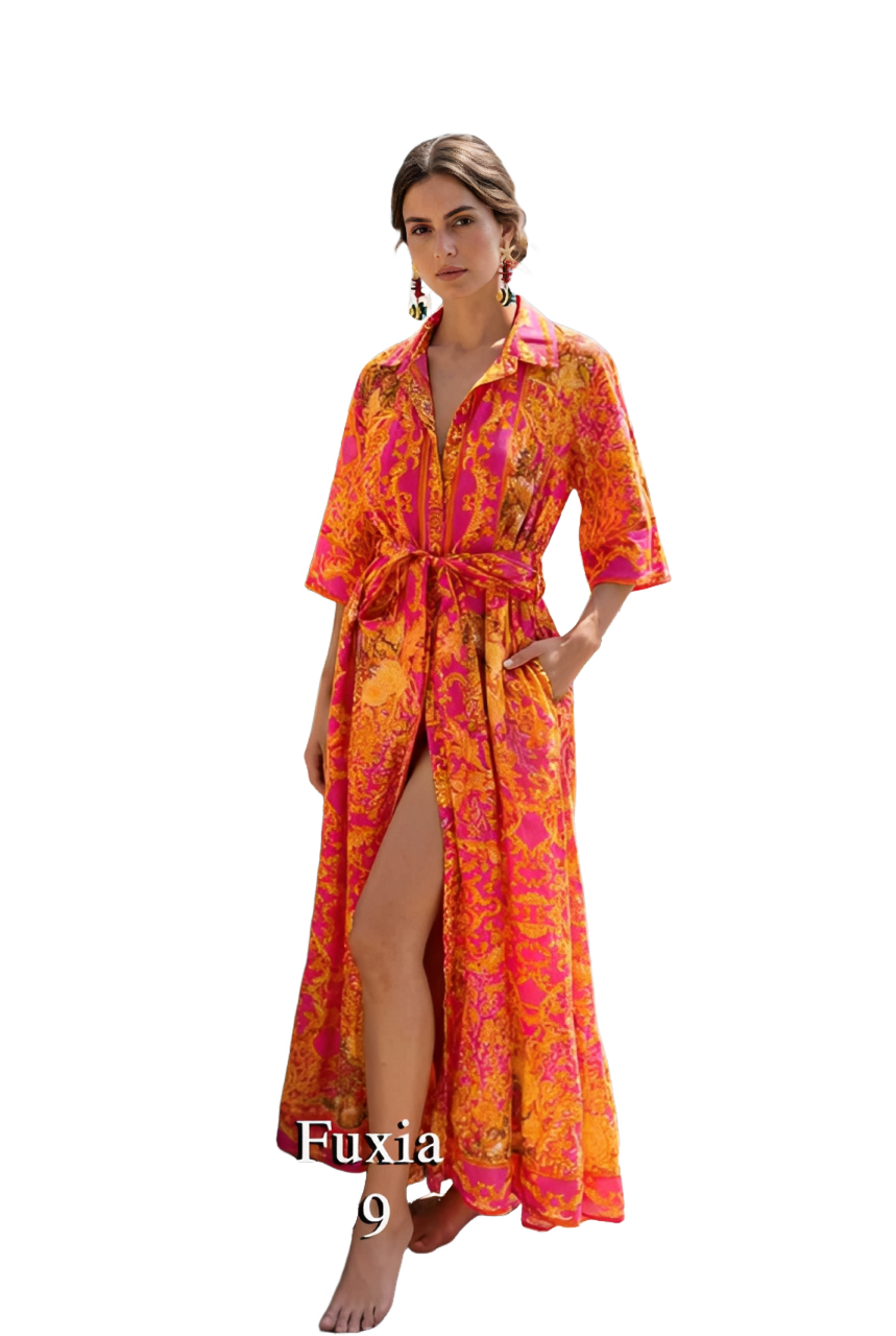 Weites, langes Hemdblusenkleid aus reiner Baumwolle mit französischen Ärmeln. Schöne Stickerei und vollständige Öffnung vorne. Großes Modell