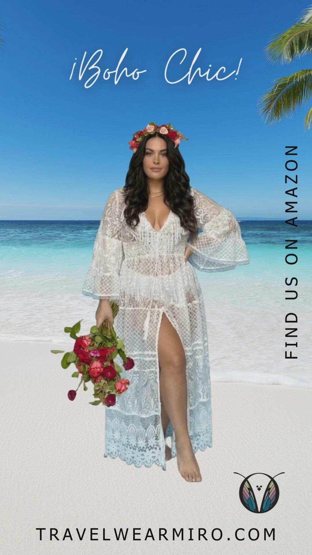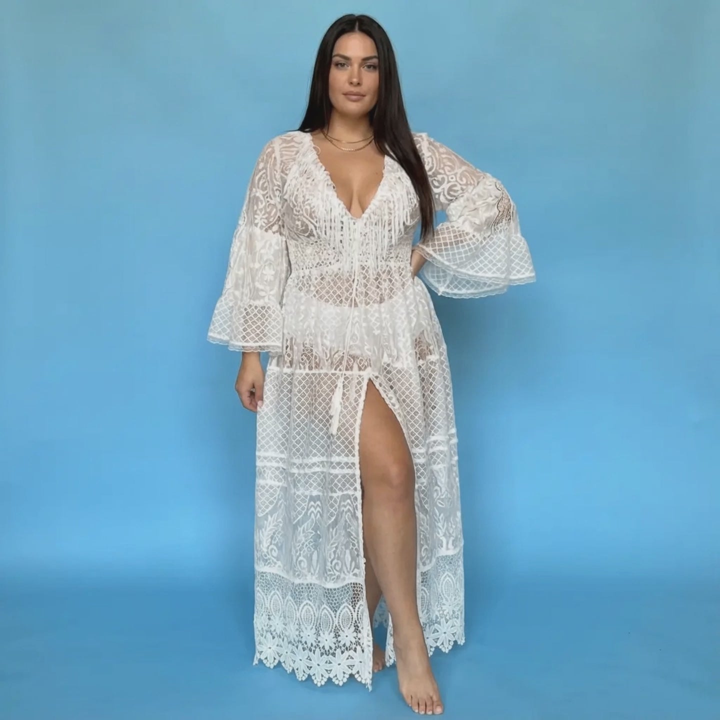 Die weiten Ärmel und der ausgestellte Rock betonen den taillenbetonten Schnitt, während der vordere Schlitz des extralangen Rocks eine sinnliche und betörende Note verleiht. Die Säume vorne und hinten sind mit Fransen verziert, wodurch ein moderner und attraktiver Effekt entsteht.