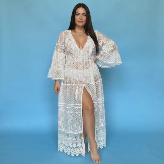 Das lange Ibiza-Kleid von Antica Sartoria, entworfen von Giacomo Cinque, ist ein elegantes und glamouröses Stück. Bei diesem Modell erreicht der Boho-Chic-Stil seinen authentischsten Ausdruck dank des integral verarbeiteten Stoffes und des Designs, das eine perfekte Balance zwischen den Dimensionen erreicht und die weibliche Silhouette betont.