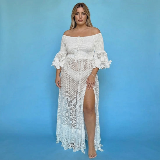 El impacto estético de este vestido es escultural y elegante, destacando su corte extralargo con abertura lateral y el estilo boho chic en un impresionante blanco total. Sumérgete en la sofisticación con este vestido Ibicenco que combina la sensualidad y el encanto boho de manera excepcional.